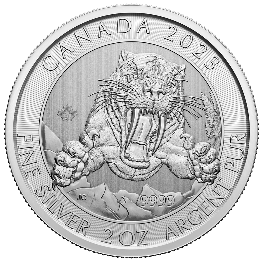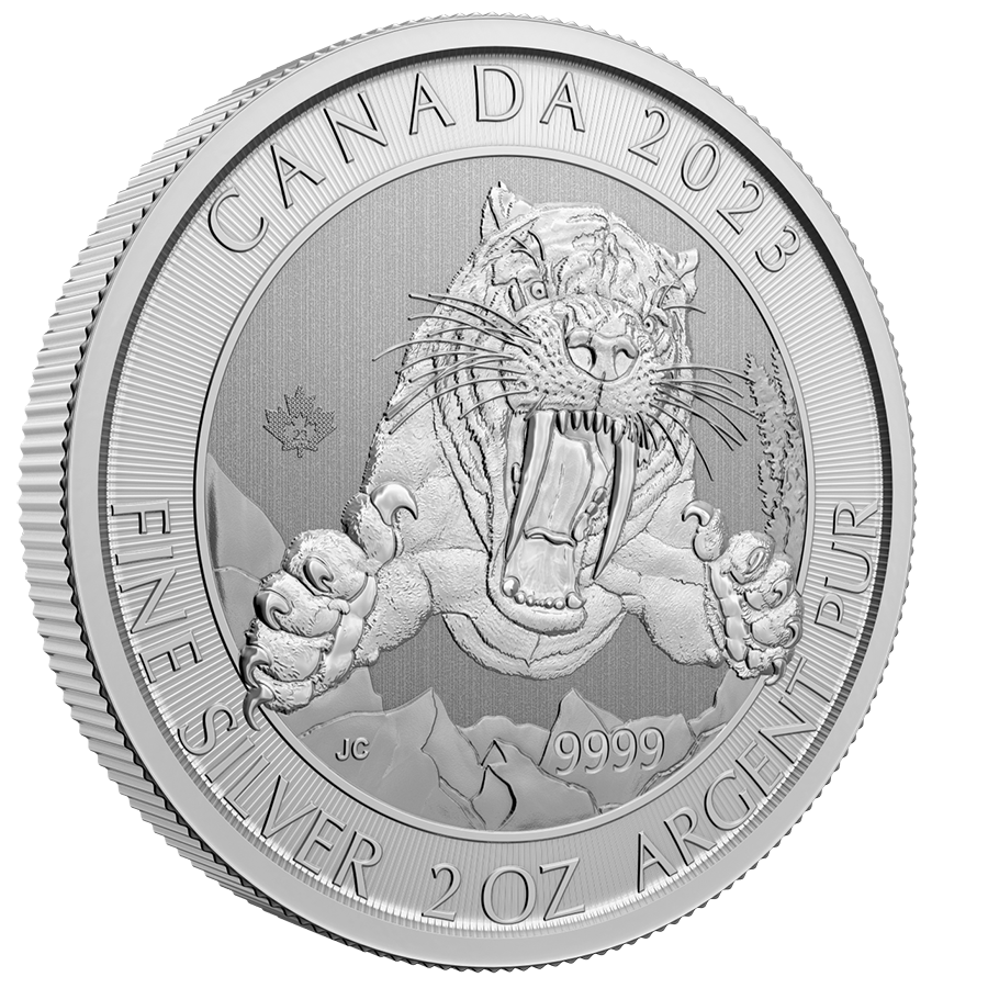 Bullion in gold and silver The debut installment of the new Ice Age series is being presented with pride by Canada. The Smilodon Sabre-tooth Cat, a predator, is shown on the coin. The unusually enormous fangs in his jaws, which protrude outward even when the mouth is closed, are his defining trait.